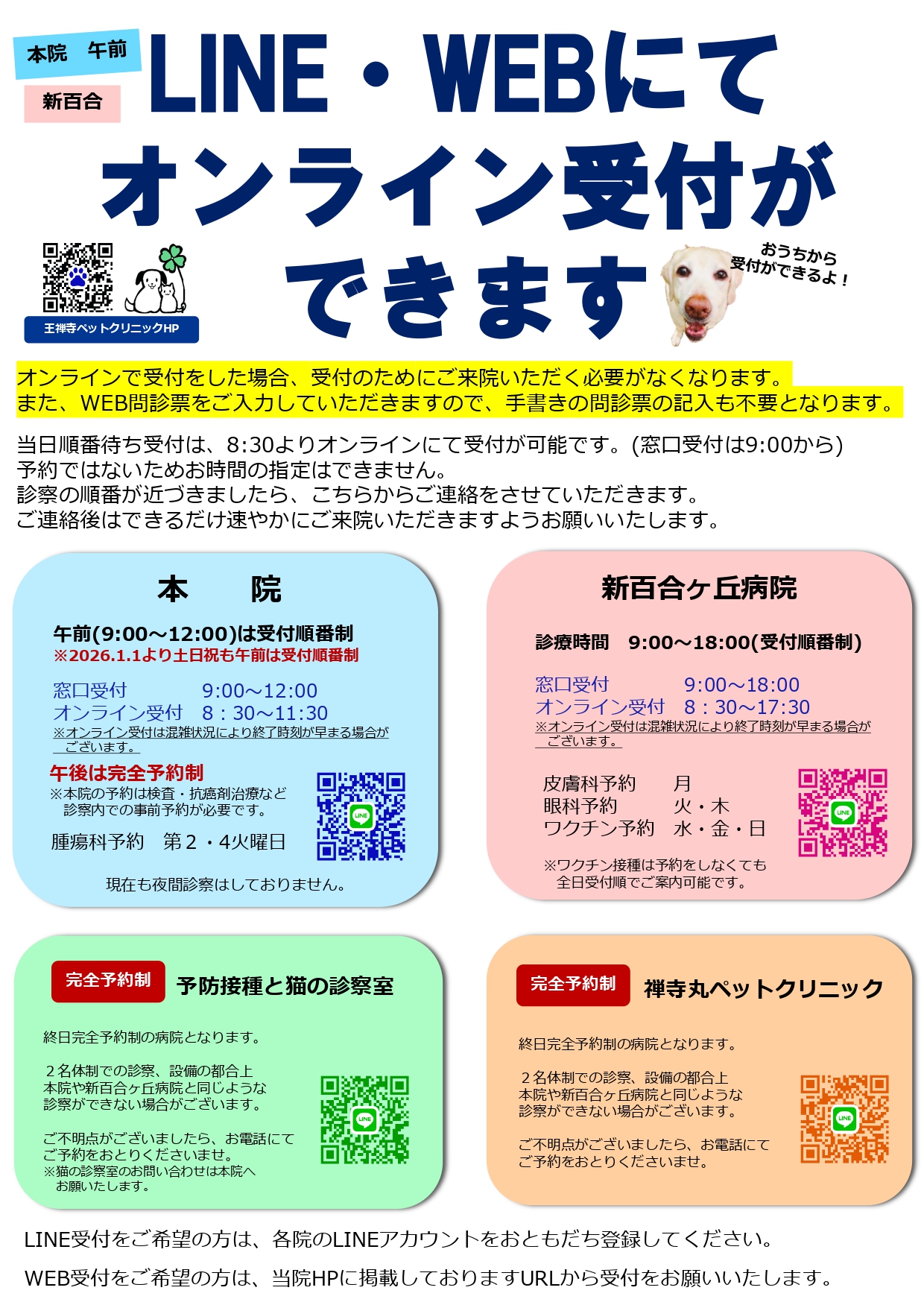 王禅寺ペットクリニックでは各病院ごとにオンライン受付が可能になりました。WEBでのご予約は下記のURLから可能となっています。クリックしていただくとそれぞれの病院ごとの予約サイトへ移動できます。こちらで予約の確認やキャンセルなどの管理も可能となっています。